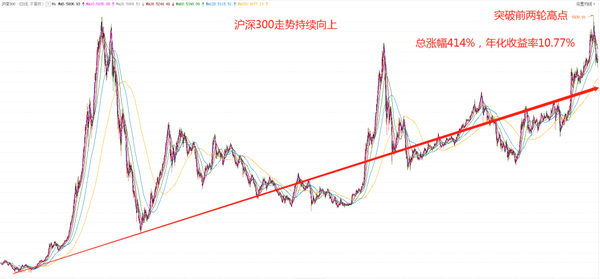 沪深300指数,总涨幅414%,年化收益率10.77%