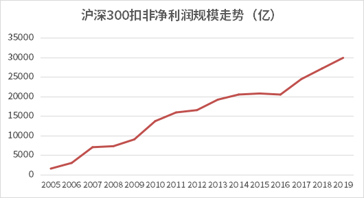 沪深300 2005年成立的时净利润规模1491亿,到2019年净利润规模增长到了2.9万亿,14年时间涨幅超过20倍,复合增速23%。