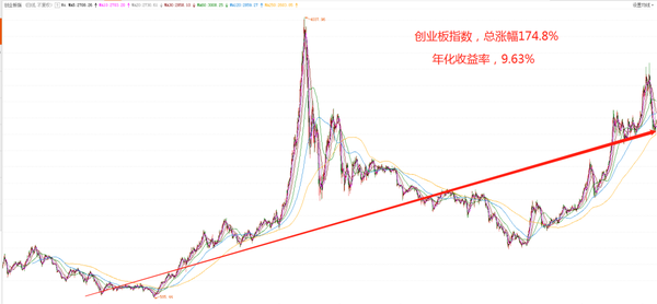 创业板指数,总涨幅174.8%,年化收益率10.77%