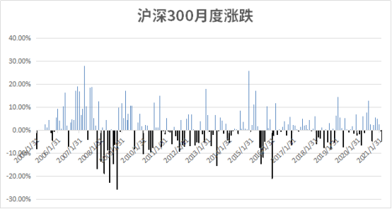 可以发现,走势极不规律,涨跌的月份几乎一样多。